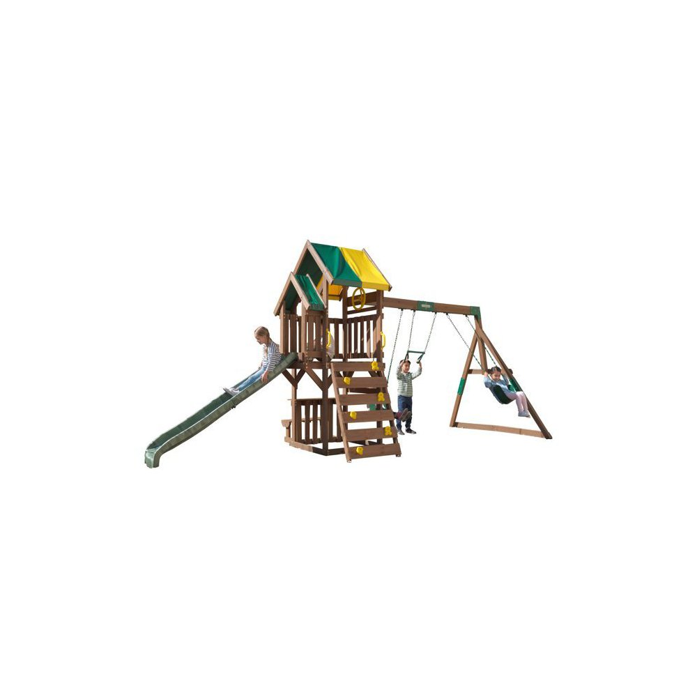 Up, down and all around, the Arbor Crest Deluxe swing set blends into your backyard like it was meant to be there. Active young bodies and minds will be entertained and challenged with the numerous activities on this playset. Swings, rock wall ladder and slide get the excitement going. A bench and table is just right for having a snack, putting on a puppet show or pretending to serve play food. The large upper deck is shaded for sunny adventures. A steering wheel propels play to distant horizons. The fun will last all day in the Arbor Crest Deluxe playset by KidKraft.